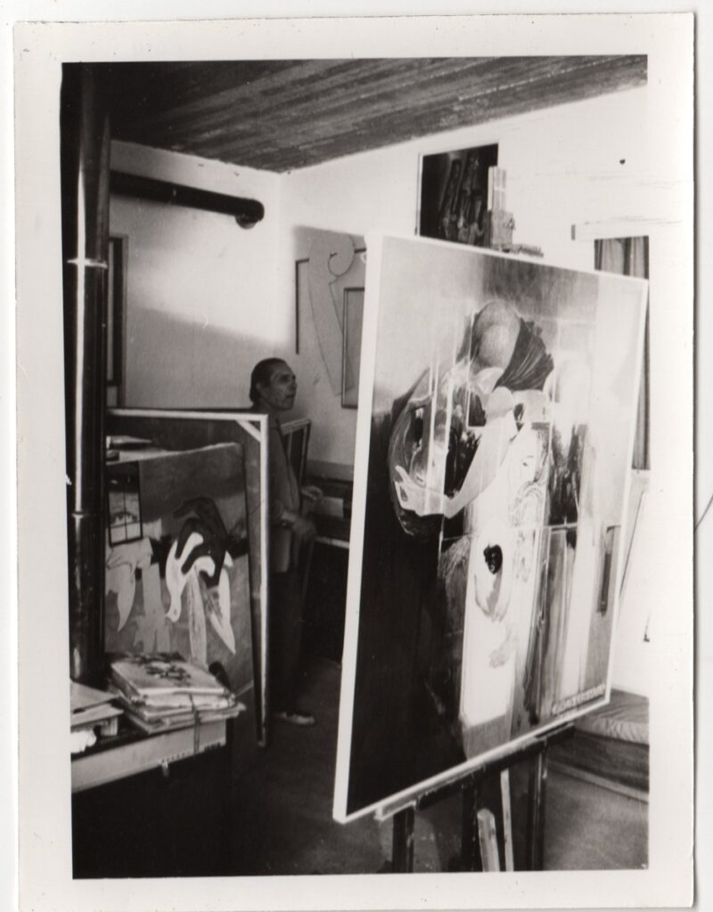 Φωτογραφία, α/μ, σε φωτογραφικό χαρτί, 12,0×9,0 εκ. Ο ζωγράφος Αλέκος Κοντόπουλος στο εργαστήριό του.