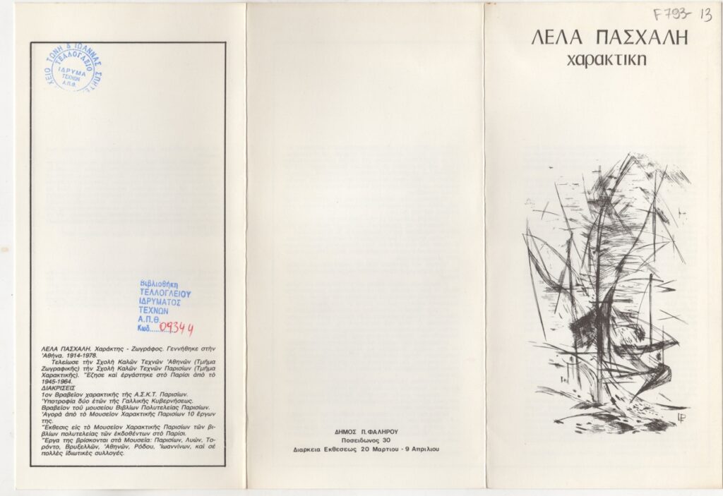 Έντυπο, χαρτόνι τρίπτυχο, 22,5×11 εκ., στα ελληνικά, έκθεσης χαρακτικής της Λέλας Πασχάλη. Περιέχει βιογραφικό σημείωμα, κείμενο του Τώνη Σπητέρη και κριτικές για την καλλιτέχνιδα δημοσίευμένες στον Τύπο.