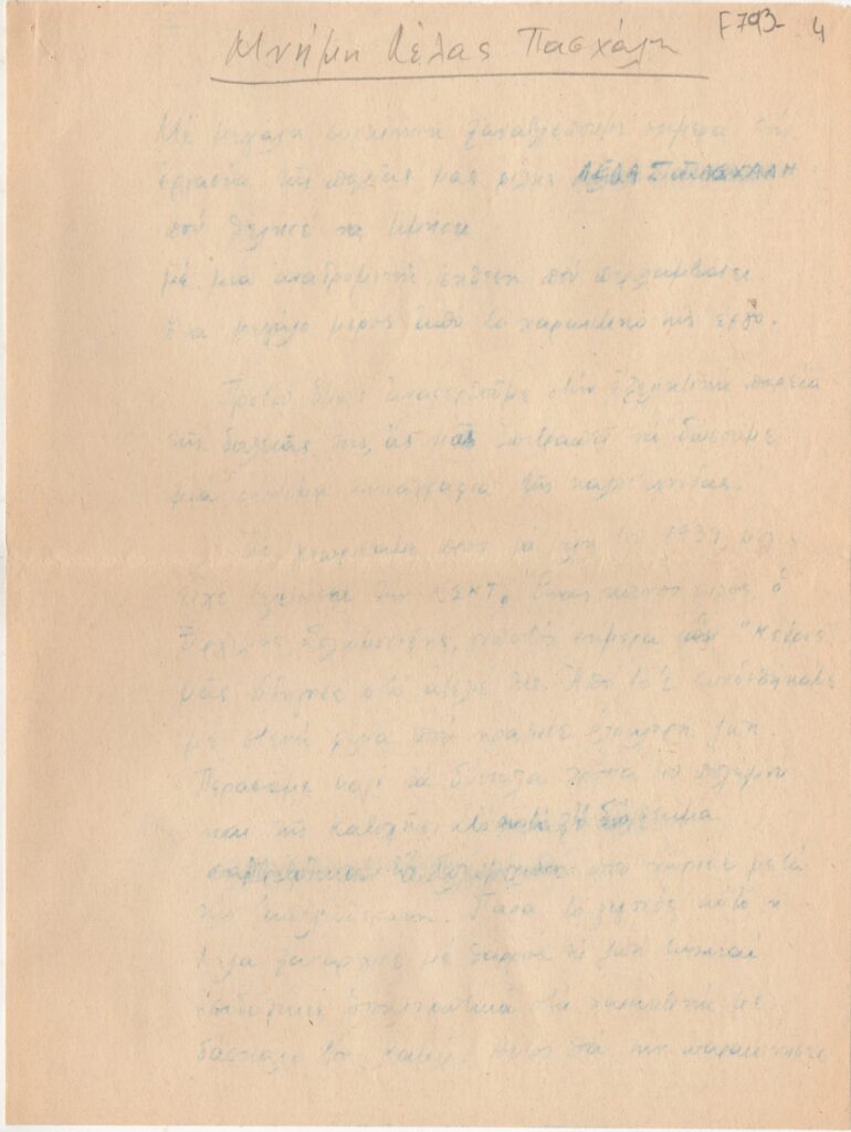 Κείμενο, χειρόγραφο, 4 φφ, 28×21 εκ., στα ελληνικά, του Τώνη Σπητέρη για τη Λέλα Πασχάλη.