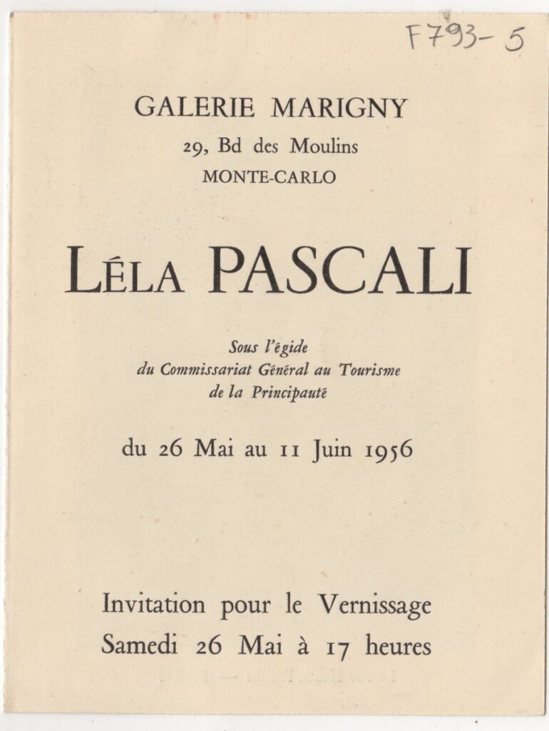 Έντυπο και πρόσκληση, χαρτόνι αναδιπλωμένο, 14×11 εκ., στα γαλλικά, ατομικής έκθεσης της Λέλας Πασχάλη στην γκαλερί Marigny στο Μόντε Κάρλο. Το έντυπο εικονογραφείται.