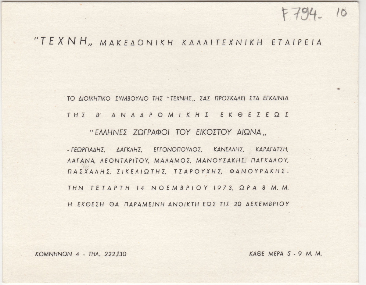 Πρόσκληση, χαρτόνι, 11,5×14.5 εκ., στα ελληνικά, εγκαινίων ομαδικής έκθεσης των Γεωργιάδη, Δαγκλή, Εγγονόπουλου, Κανέλλη, Καραγάτση, Λαγανά, Λεονταρίτου, Μαλάμου, Μανουσάκη, Παγκάλου, Πασχάλη, Σικελιώτη, Τσαρούχη, Φανουράκη, η οποία διεξάγεται στην Τέχνη Μακεδονική Καλλιτεχνική Εταιρεία, στη Θεσσαλονίκη.