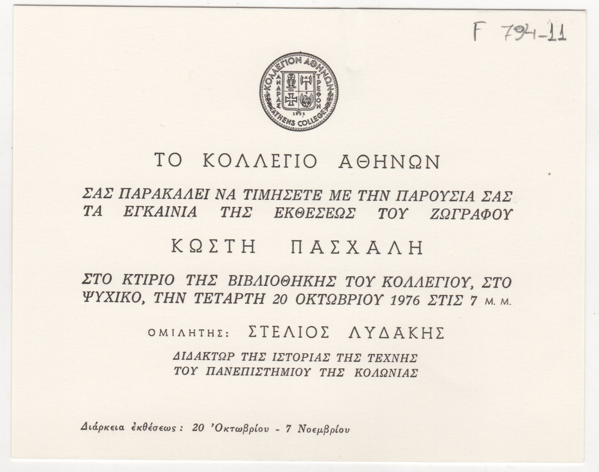 Πρόσκληση, χαρτόνι, 11,5×14,5 εκ., στα ελληνικά, εγκαινίων έκθεσης του Κωστή Πασχάλη.