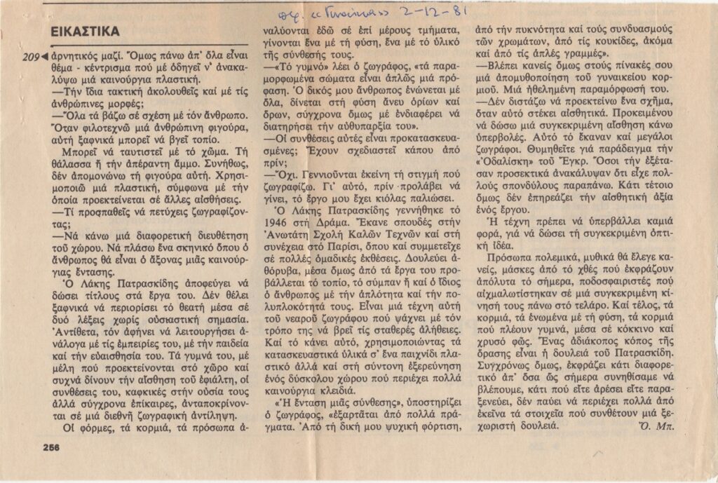 Απόκομμα, χαρτί, 2 φφ,19,5×23 και 15,5×23 εκ., στα ελληνικά, δημοσίευσης συνέντευξης του Λάκη Πατρασκίδη, με αφορμή έκθεση του στο Καλλιτεχνικό Πνευματικό Κέντρο Ώρα.