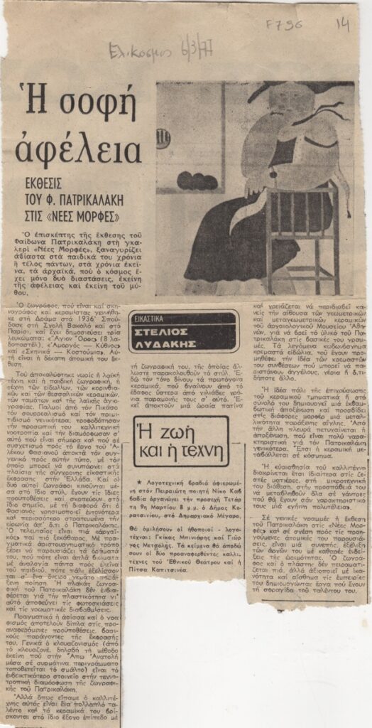 Απόκομμα, χαρτί ακανόνιστου μεγέθους, στα ελληνικά, δημοσίευσης κριτικής έκθεσης του Φαίδωνα Πατρικαλάκι, η οποία διεξάγεται στην Γκαλερί Νέες Μορφές στην Αθήνα.