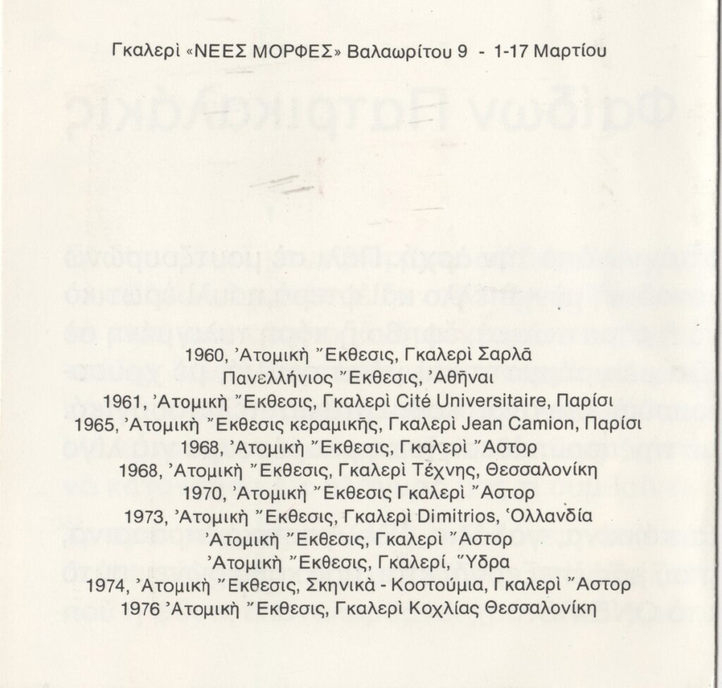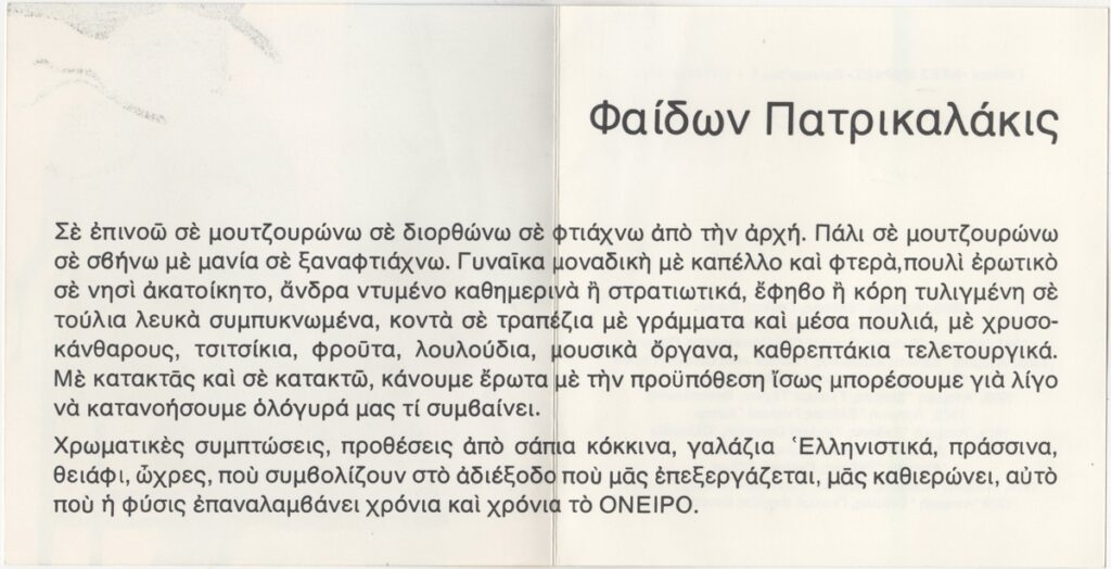 Έντυπο, χαρτόνι αναδιπλωμένο, 16,5×16,5 εκ., στα ελληνικά, έκθεσης του Φαίδωνα Πατρικαλάκι.