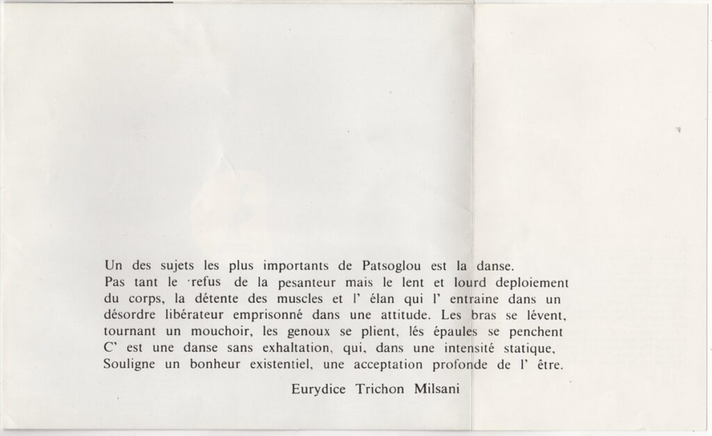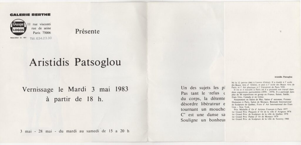 Έντυπο και πρόσκληση, χαρτί αναδιπλωμένο, 20×22 εκ., στα γαλλικά, έκθεσης του Αριστείδη Πατσόγλου στο Παρίσι.