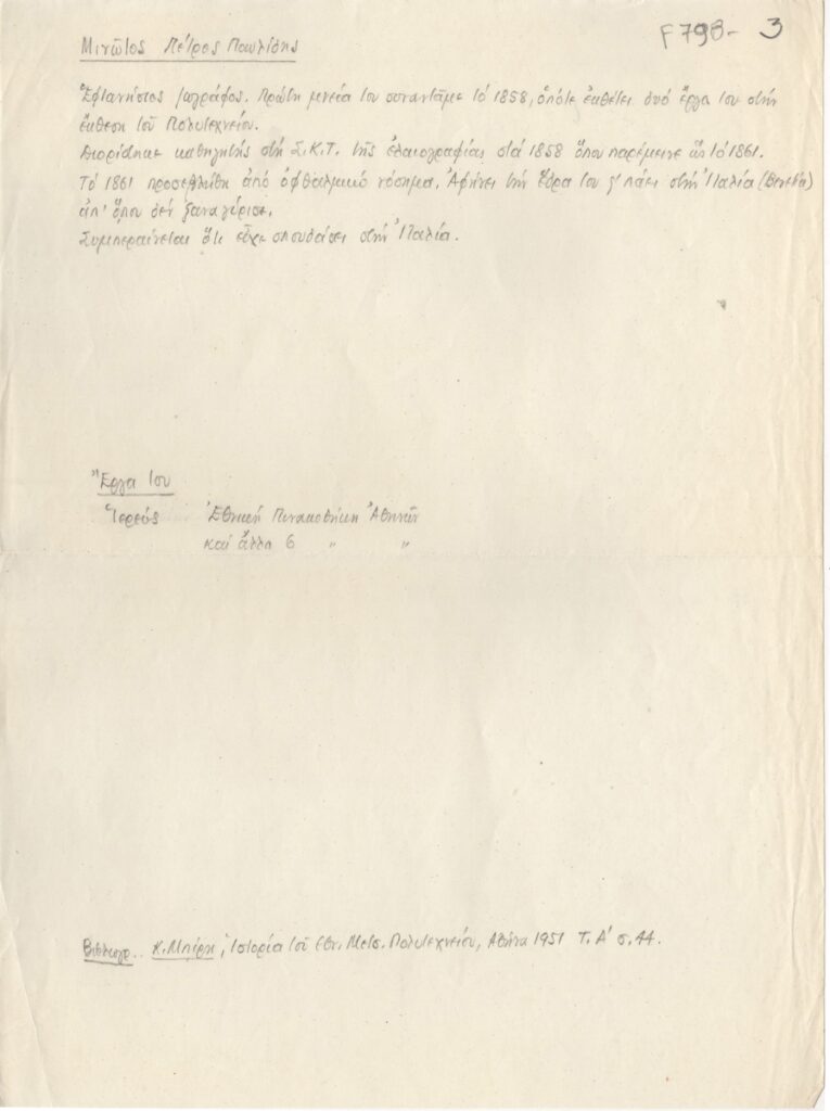 Βιογραφικό, χειρόγραφο, χαρτί, 28×21 εκ., στα ελληνικά, του Πέτρου Παυλίδη Μινώτου. Αναγράφονται σπουδές, έργα και βιβλιογραφία.