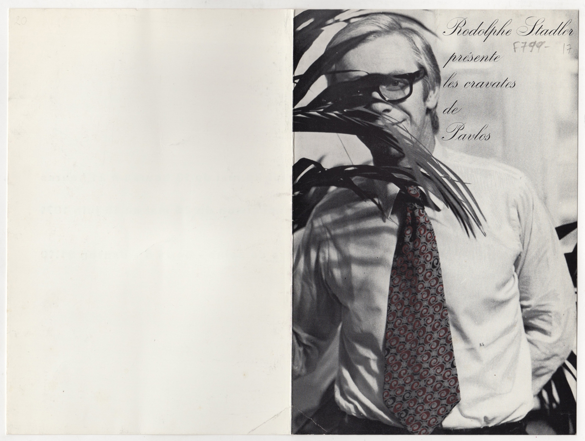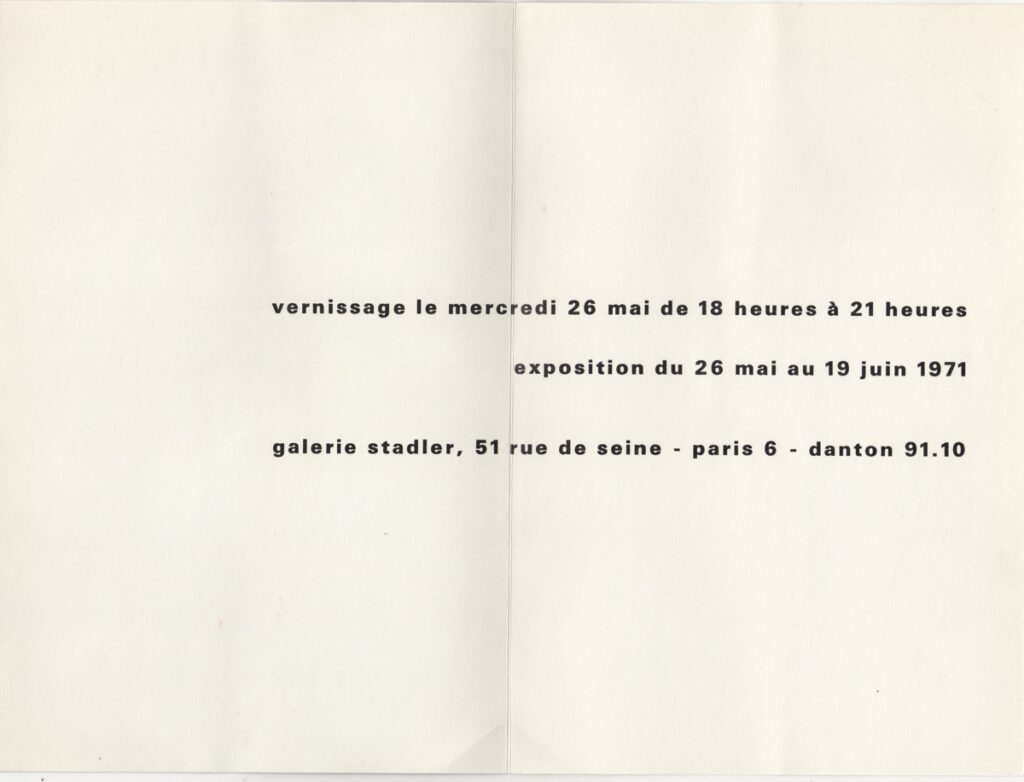 Πρόσκληση, χαρτόνι αναδιπλωμένο, 21×14 εκ., στα γαλλικά, εγκαινίων ατομικής έκθεσης του Παύλου Διονυσόπουλου, η οποία διεξάγεται στη Galerie Stadler, στο Παρίσι.