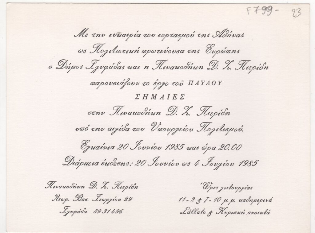 Πρόσκληση, χαρτόνι, 14×18,5 εκ., στα ελληνικά, εγκαινίων έκθεσης του Παύλου (Διονυσόπουλου) στην Αθήνα.