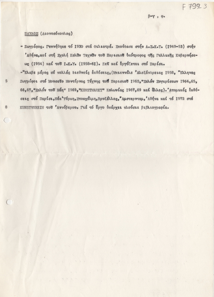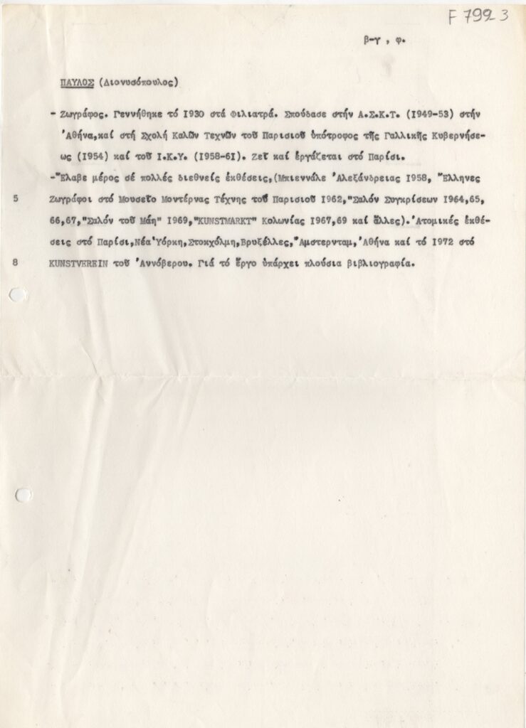 Βιογραφικό, δακτυλόγραφο, χαρτί, 29,5×21 εκ., στα ελληνικά, του Πάυλου Διονυσόπουλου. Αναγράφονται συνοπτικά σπουδές, μετακινήσεις, εκθέσεις.