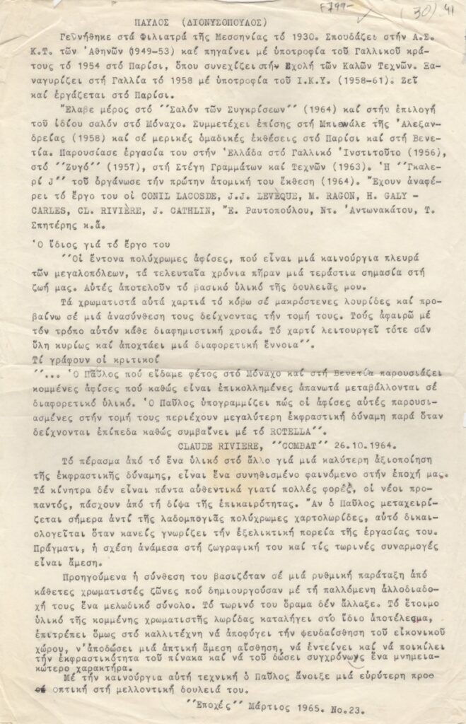 Αποδελτίωση, δακτυλόγραφη, ριζόχαρτο, 33×21 εκ., στα ελληνικά, άρθρου του Τώνη Σπητέρη. Περιέχει βιογραφικά του Παύλου (Διονυσόπουλου) και κριτική του Claude Rivière.