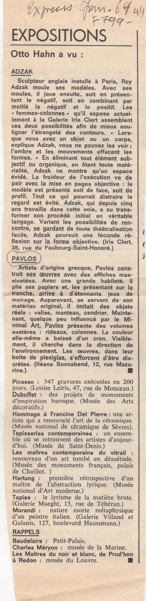 Απόκομμα, χαρτί, 28×7 εκ., στα γαλλικά, δημοσίευσης κριτικών εκθέσεων των Adzak και Παύλου (Διονυσόπουλου) στο Παρίσι.