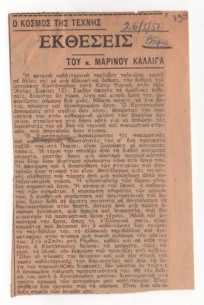 Απόκομμα, έντυπο, στα ελληνικά, χαρτί, 13,0×8,3 εκ., όπου δημοσιεύεται κριτική του Μαρίνου Καλλιγά για την ατομική έκθεση ζωγραφικής του Αλέκου Κοντόπουλου στην Αθήνα το 1951. Επάνω, επιγραφή με τα στοιχεία της δημοσίευσης.