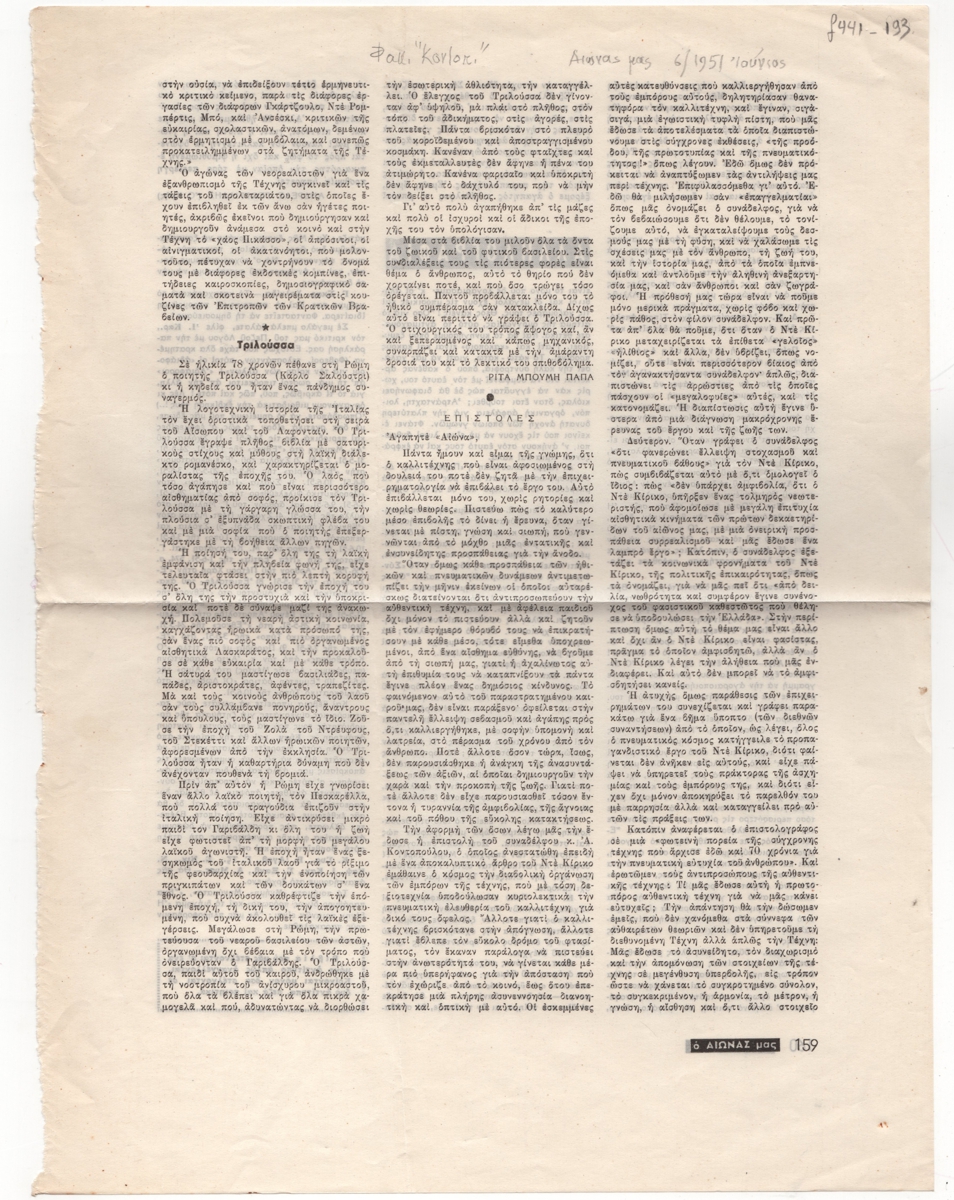 Απόκομμα περιοδικού, στα ελληνικά, χαρτί, 32,5×24,3 εκ. Επιστολή του Ανδρέα Γεωργιάδη με αφορμή την επιστολή του Αλέκου Κοντόπουλου που σχολίασε το άρθρο του Giorgio De Chirico σχετικά με το ρόλο των εμπόρων τέχνης και τον τρόπου με τον οποίο ελέγχουν την πνευματική ελευθερία του καλλιτέχνη. Επάνω επιγραφές με τα στοιχεία δημοσίευσης.
