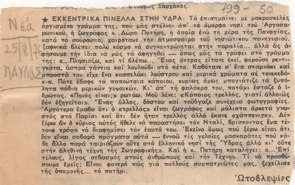 Απόκομμα, χαρτί, 7×11,5 εκ., στα ελληνικά, δημοσίευσης άρθρου αναφερόμενου που μεταφέρει σκηνή με πρωταγωνιστή τον Παύλο (Διονυσόπουλο).