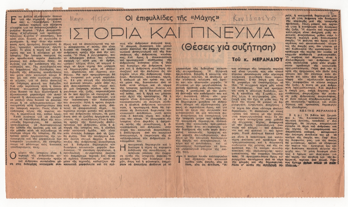 Απόκομμα, έντυπο, στα ελληνικά, χαρτί, 16,8×29,6 εκ., όπου δημοσιεύεται κριτική του Κωστή Μεραναίου για την έκδοση του Αλέκου Κοντόπουλου με τίτλο “Η σημερινή ζωγραφική”. Επάνω επιγραφές με τα στοιχεία δημοσίευσης. Στην άλλη όψη η στήλη “Σημειώσεις στο περιθώριο”