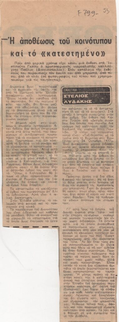 Απόκομμα, χαρτί ακανόνιστου μεγέθους, στα ελληνικά, δημοσίευσης κριτικής έκθεσης του Παύλου (Διονυσόπουλου), η οποία διεξάγεται στο Ινστιτούτο Goethe της Αθήνας.