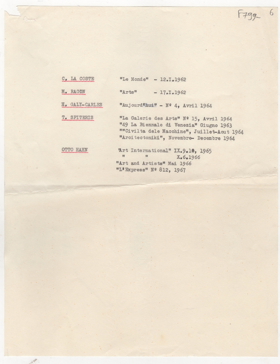 Αναγράφονται δημοσιεύσεις για τον καλλιτέχνη δημοσιευμένες στον γαλλικό Τύπο.