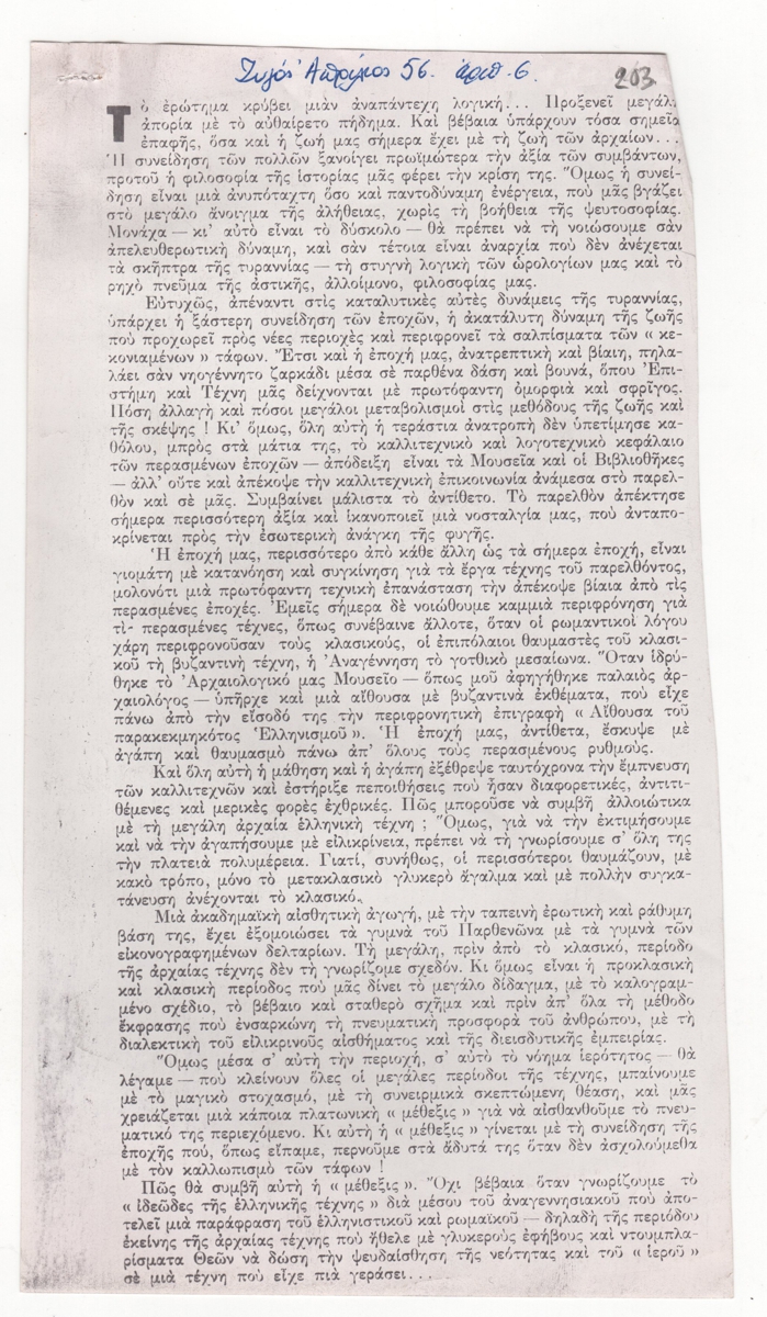 Φωτοαντίγραφο αποκόμματος περιοδικού, στα ελληνικά, χαρτί, 2 φφ, 21,0×12,0 και 2,5×10,5 εκ. Κείμενο του ζωγράφου Αλέκου Κοντόπουλου με θεωρητικές απόψεις για την τέχνη. Επάνω, επιγραφή με τα στοιχεία δημοσίευσης.