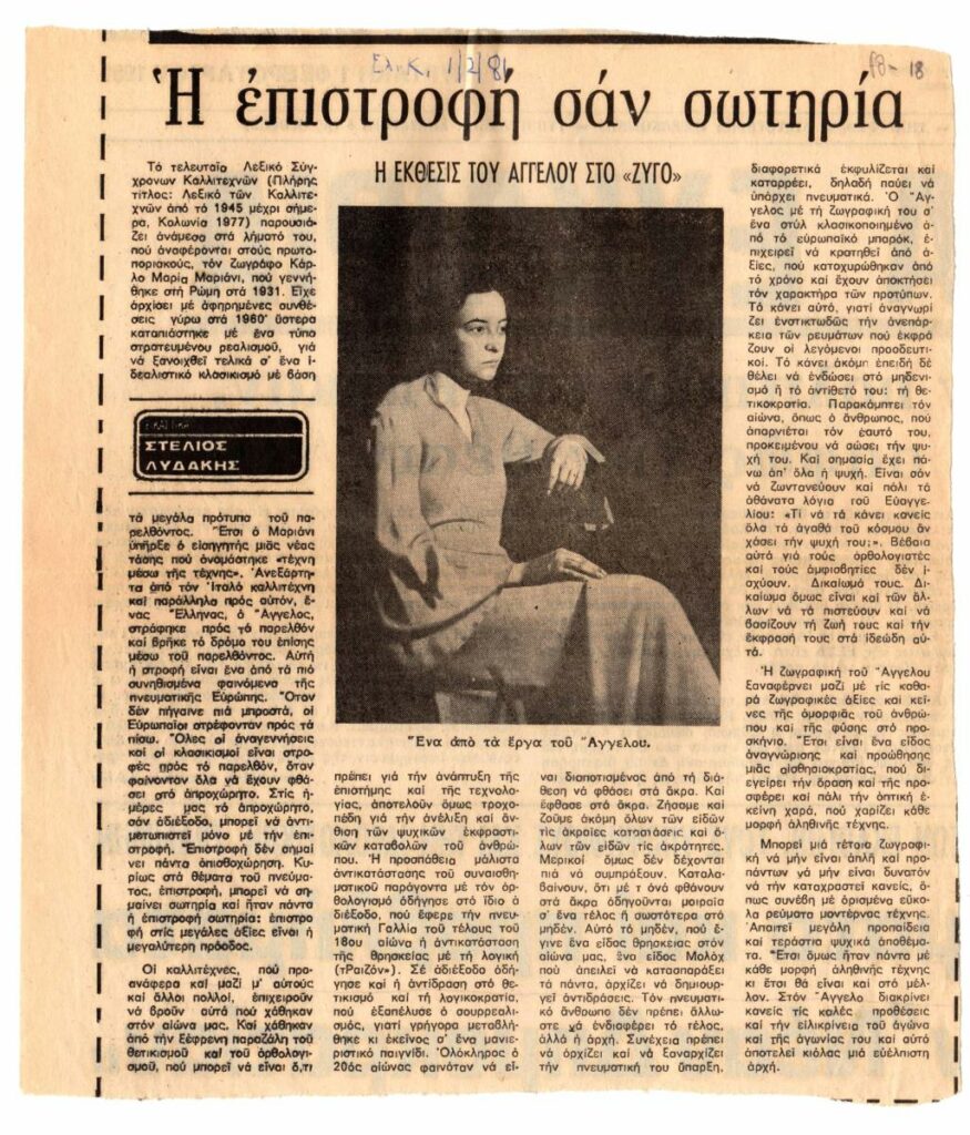 Απόκομμα, χαρτί, 24×20,5 εκ, στα ελληνικά, δημοσίευσης άρθρου το οποίο αναφέρεται στον Άγγελο (Παναγιώτου) και το έργο του.