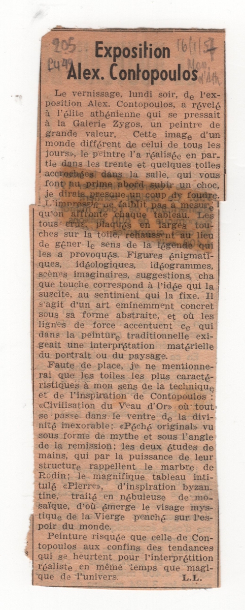 Απόκομμα, έντυπο, χαρτί, 15,0×5,0 εκ., όπου δημοσιεύεται, στα γαλλικά, κριτική της έκθεσης του Αλέκου Κοντόπουλου στην Αθήνα το 1957. Επάνω επιγραφή με τα στοιχεία της δημοσίευσης.