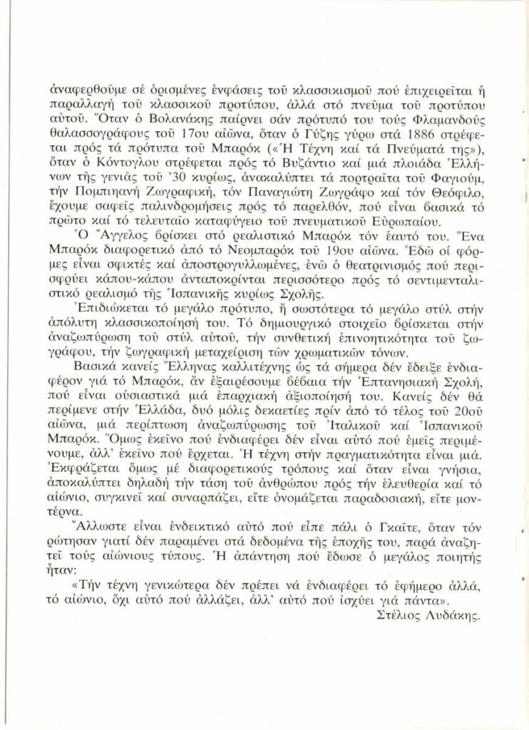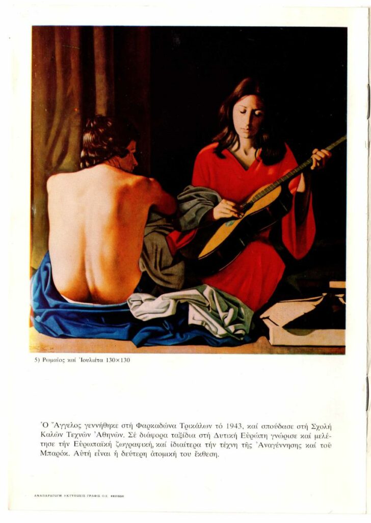 Έντυπο της ατομικής έκθεσης του Άγγελου (Παναγιώτου), στην γκαλερί Αργώ. Περιέχει κείμενο για τον καλλιτέχνη, από το Στέλιο Λυδάκη, σύντομο βιογραφικό του και εικονογράφηση.