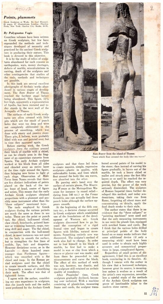 Απόκομμα, χαρτί ιλλουστρασιόν, 31×16,5 εκ., στα αγγλικά, με βιβλιοκριτική του Πολύγνωτου Βαγή αναφορικά με το βιβλίο του Carl Bluemel, με τίτλο “Greek sculptors at work”.