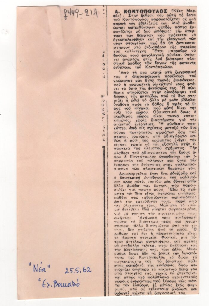 Φωτοαντίγραφο αποκόμματος εφημερίδας, στα ελληνικά, χαρτί, 15,3×9,7 εκ. Κριτικής της Ελένης Βακαλό για την ατομική έκθεση ζωγραφική του Αλέκου Κοντόπουλου στην Αθήνα το 1962. Κάτω αριστερά επιγραφή με τα στοιχεία δημοσίευσης.