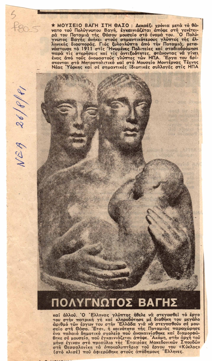Απόκομμα, χαρτί, 20,5×11,5 εκ., στα ελληνικά, δημοσίευσης άρθρου αναφερόμενου στο άνοιγμα του Μουσείου Βαγή, στη Θάσο, στη μνήμη του Πολύγνωτου Βαγή.