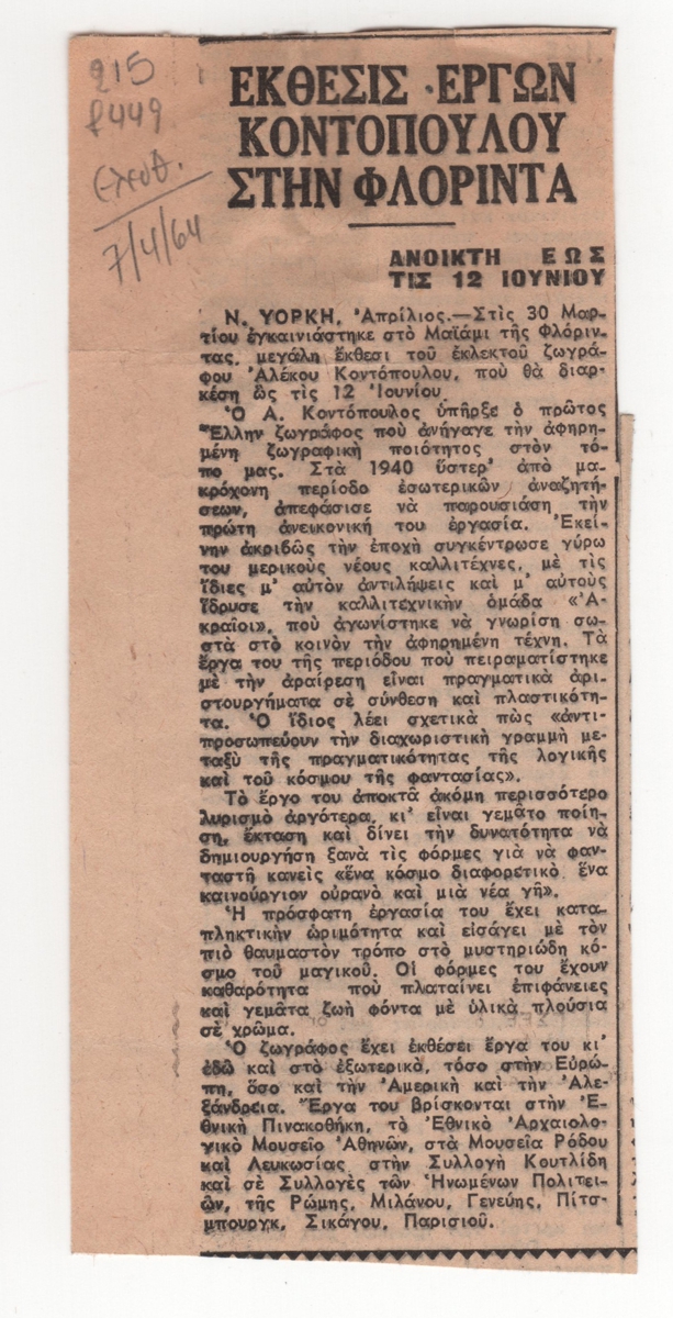 Απόκομμα, έντυπο, στα ελληνικά, χαρτί, 14,6×6,6 εκ., όπου δημοσιεύεται κριτική της ατομικής έκθεσης ζωγραφικής του Αλέκου Κοντόπουλου στην Φλόριντα των Η.Π.Α. το 1964. Αριστερά, επιγραφή με τα στοιχεία δημοσίευσης.