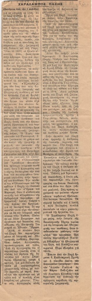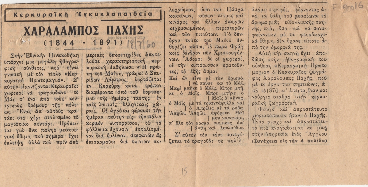 Απόκομμα, χαρτί, 2 φφ, 11,5×23 και 39×11,5 εκ., στα ελληνικά, δημοσίευσης αναφερόμενης στο έργο του Χαράλαμπου Παχή με τίτλο “Κερκυραϊκή Πρωτομαγιά” το οποίο φυλάσσεται στην Εθνική Πινακοθήκη.
