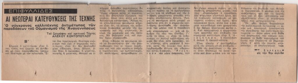 Αποκόμματα εφημερίδας, στα ελληνικά, χαρτί, 2 φφ, 8,8×31,2 και 34,5×16,8 εκ. Θεωρητικό κείμενο του Αλέκου Κοντόπουλου για τις νεώτερες καλλιτεχνικές τάσεις, το οποίο παρουσιάστηκε σε ομιλία του στην Γκαλερί “Άστορ” το 1969. Στο πρώτο απόκομμα, επιγραφή με τα στοιχεία δημοσίευσης.