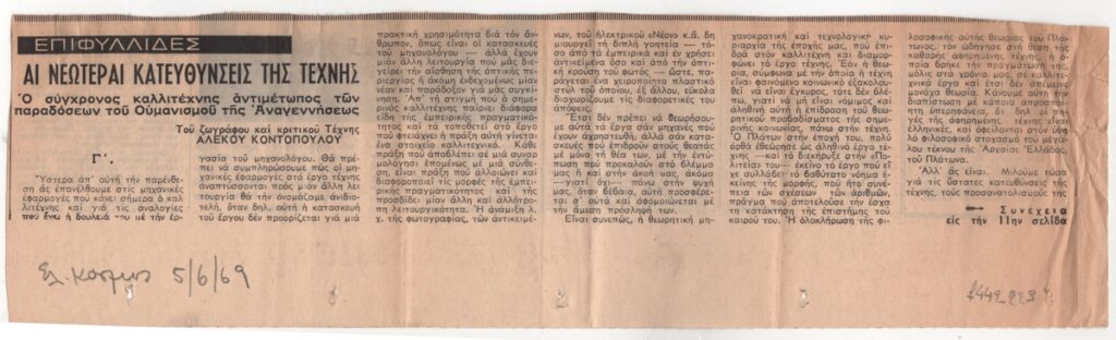 Αποκόμματα εφημερίδας, στα ελληνικά, χαρτί, 18,2×10,7 και 9,0×31,0 εκ. Θεωρητικό κείμενο του ζωγράφου Αλέκου Κοντόπουλου με θέμα τις νεώτερες καλλιτεχνικές τάσεις. Βασίζεται σε ομιλία του καλλιτέχνη στην Γκαλερί Άστορ το 1969. Στο πρώτο απόκομμα επιγραφή με τα στοιχεία δημοσίευσης.