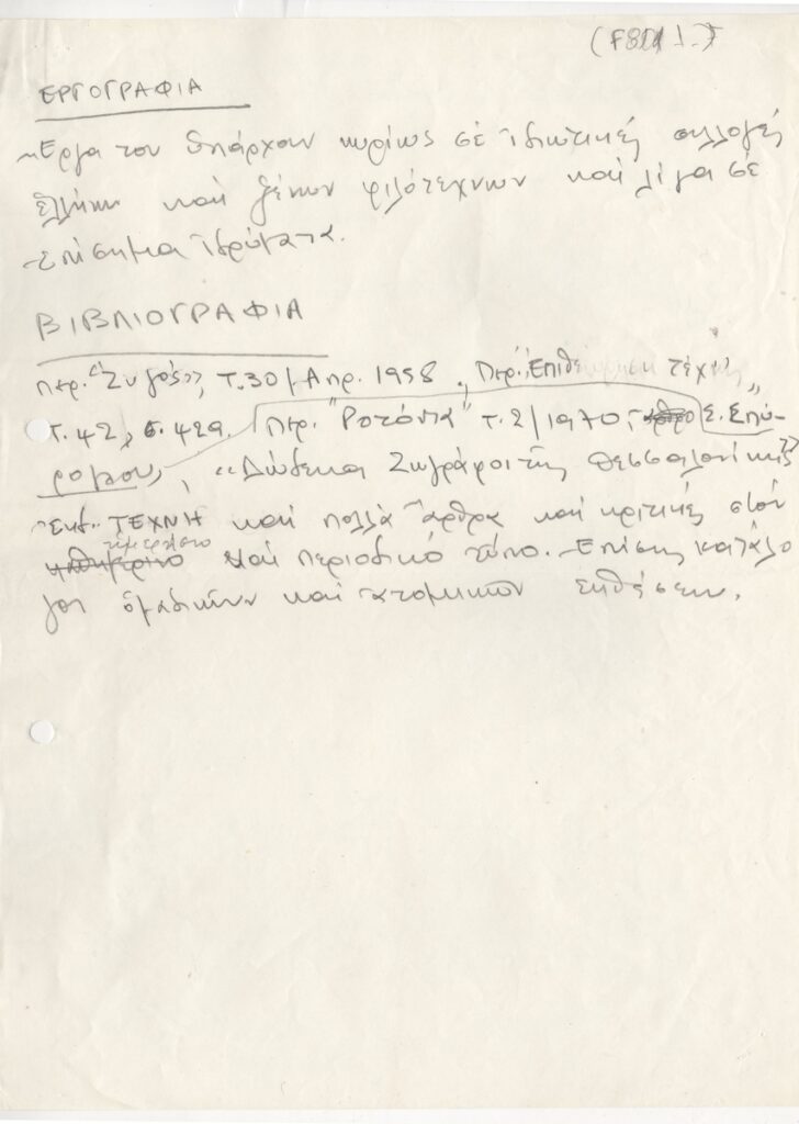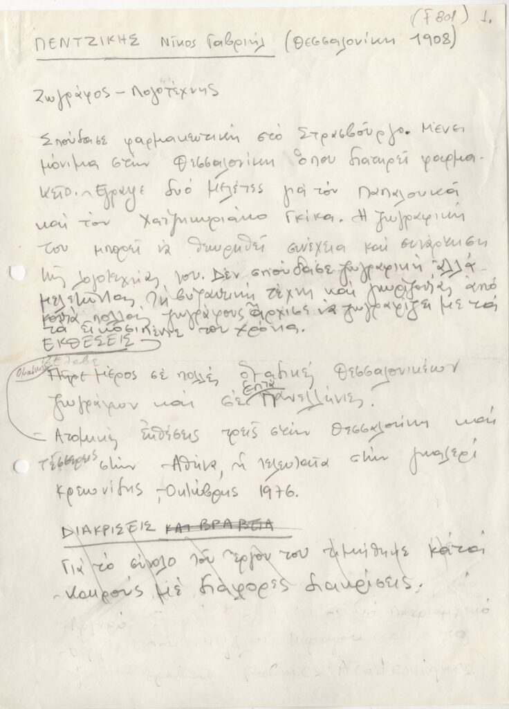 Βιογραφικό, χειρόγραφο, χαρτί, 2 φφ, 29×21,5 εκ., στα ελληνικά, του Νίκου Γαβριήλ Πεντζίκη. Περιέχει σπουδές, εκθέσεις, διακρίσεις και βραβεία, εργογραφία και βιβλιογραφία.