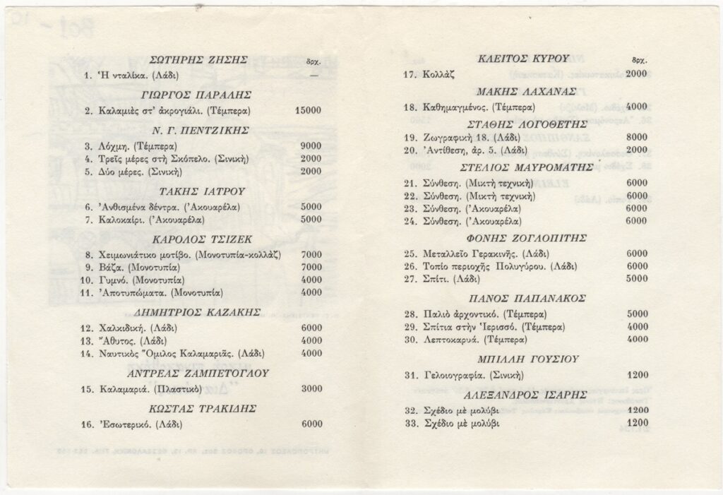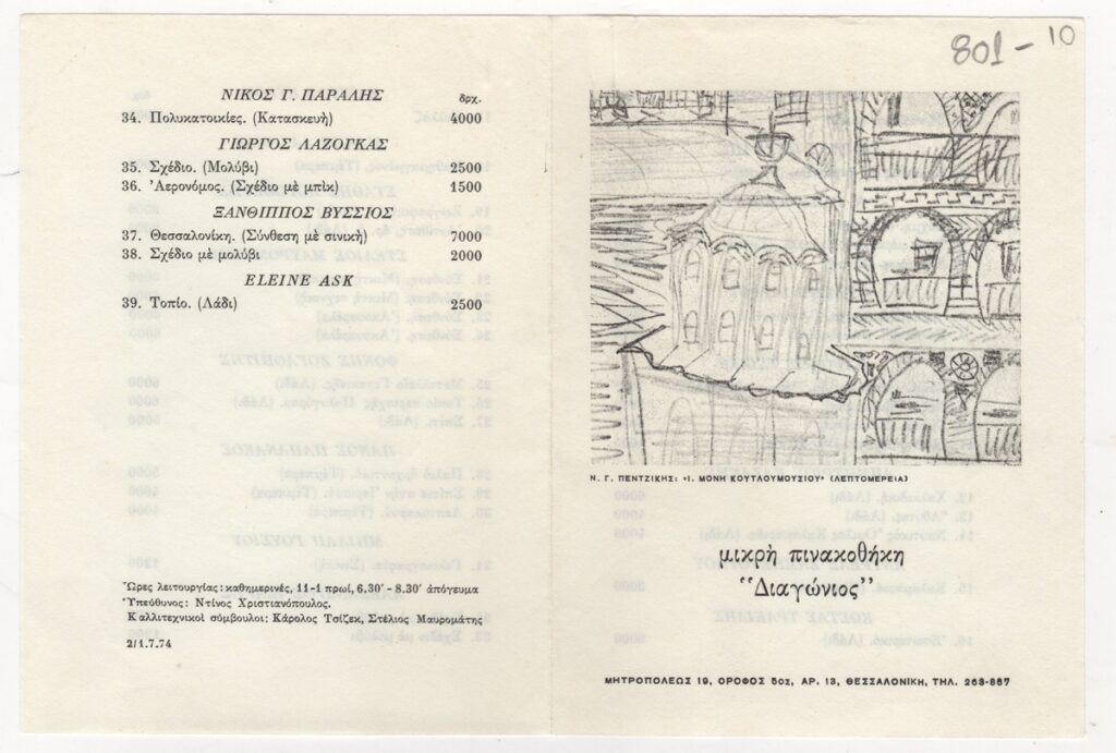 Τιμοκατάλογος, χαρτί αναδιπλωμένο,14,5×11 εκ., στα ελληνικά, έργων ομαδικής έκθεσης, η οποία διεξάγεται στην Μικρή Πινακοθήκη “Διαγώνιος” στη Θεσσαλονίκη. Συμμετέχουν οι: Σωτήρης Ζήσης, Γιώργος Παραλής, Ν. Γ. Πεντζίκης, Τάκης Ιατρού, Κάρολος Τζίσεκ, Δημήτριος Καζάκης, Αντρέας Ζαμπέτογλου, Κώστας Τρακίδης, Κλείτος Κύρου, Μάκης Λαχανάς, Στάθης Λογοθέτης, Στέλιος Μαυρομάτης, Φώνης Ζογλοπίτης, Πάνος Παπανάκος, Μπίλλη Γουσίου, Αλέξανδρος Ίσαρης, Νίκος Παραλής, Γιώργος Λαζόγκας, Ξάνθιππος Βύσσιος και Eleine Ask.