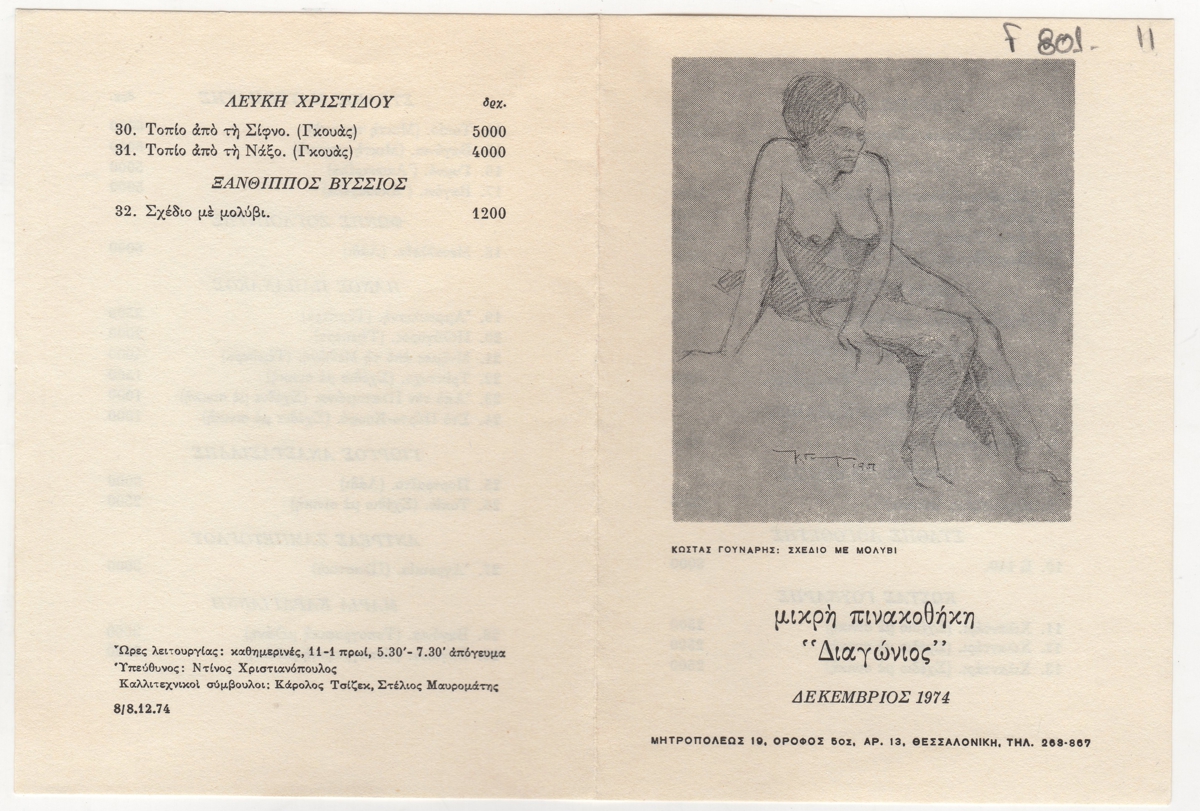 Τιμοκατάλογος, χαρτί αναδιπλωμένο,14,5×10,5 εκ., στα ελληνικά, ομαδικής έκθεσης, η οποία διεξάγεται στην Μικρή Πινακοθήκη “Διαγώνιος”, στη Θεσσαλονίκη. Συμμετέχουν με έργα τους οι: Γιώργος Παραλής, Ν. Γ. Πεντζίκης, Κάρολος, Τσίζεκ, Βασίλης Ρογκότης, Δημήτρης Καζάκης, Κώστας Τρακίδης, Στάθης Λογοθέτης, Κώστας Γούναρης, Στέλιος Μαυρομάτης, Πάνος Παπανάκος, Φώνης Ζογλοπίτης, Γιώργος Αναστασιάδης, Αντρέας Ζαμπέτογλου, Μαρία Καραγιάννη, Λευκή Χριστίδου, Ξάνθιππος Βύσσιος. Το έντυπο εικονογραφείται.