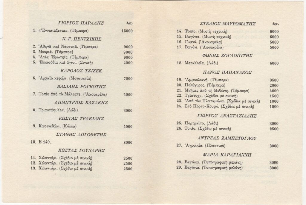 Ιωάννα Σπητέρη-Βεροπούλου (1920 - 2000) ; Σπύρος Βασιλείου (1902 - 1985) ; Ορέστης Κανέλλης (1910 - 1979) ; Λουκία Μαγγιώρου (1914 - 2008) ; Τάσσος Α. (1914 - 1985) ; Γιάννης Μηταράκης (1898 - 1963) ; Αγήνωρ Αστεριάδης (1898 - 1977) ; Γιώργος Σικελιώτης (1917 - 1984) ; Ντιάνα Αντωνακάτου (1922 - 2011) ; Τάκης Ελευθεριάδης (1911 - 1987) ; Ερρίκος Κ. Φραντζισκάκης (1908 - 1958) ; Αντώνης Σώχος (1888 - 1975) ; Γιώργος Μπουζιάνης (1885 - 1959) ; Σωκράτης Καραντινός (1906 - 1979) ; Φώτης Ζαχαρίου (1909 - 2001) ; Μαρία Αναγνωστοπούλου-Βρανίκα (1890 - 1971) ; Νίκη Καραγάτση-Καρυστινάκη (1914 - 1986) ; Χρήστος Λεφάκης (1906 - 1968) ; Ιουλία Παπανούτσου (1900 - 1973) ; Γεώργιος Παραλής (1908 - 1975) ; Πολύκλειτος Ρέγκος (1903 - 1984) ; Γιάννης Στεφανέλλης