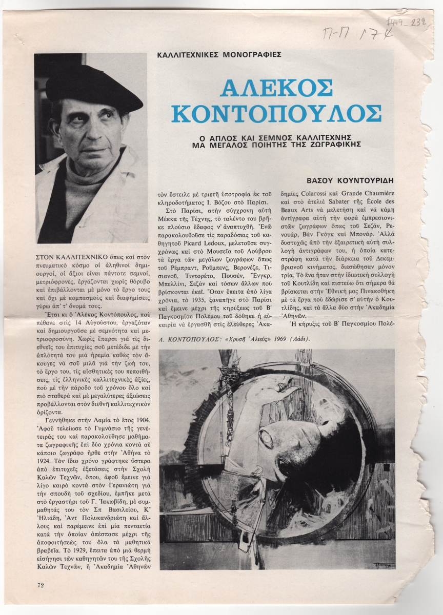 Απόκομμα, έντυπο, στα ελληνικά, χαρτί ιλουστρασιόν, 3 φφ, 33,0×24,0 εκ. Άρθρο του Βάσου Κουντουρίδη για τον ζωγράφο Αλέκο Κοντόπουλου στη στήλη “Καλλιτεχνικές μονογραφίες”. Δίνονται βιογραφικά στοιχεία, περιγράφεται η επαγγελματική πορεία του καλλιτέχνη, στοιχεία για τις εκθέσεις του και επιχειρείται κριτική αποτίμηση του έργου του. Στην πρώτη σελίδα επιγραφή με τα στοιχεία δημοσίευσης. Στην πίσω όψη του πρώτου φύλλου, εκθεσιολόγιο, εικονογραφημένο με αναπαραγωγή έργων της Ρίτας Κολονέλου-Μπούρα και Ντίνου Μαγδαληνού. Στην πίσω όψη της του τρίτου φύλλου, συνέντευξη του ηθοποιού Βάσου Ανδριανού στην Πόπη Λαμπροπούλου.