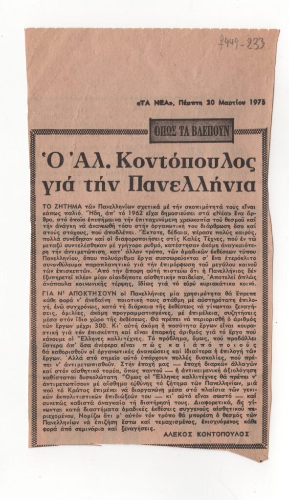 Απόκομμα, έντυπο, στα ελληνικά, χαρτί, 17,0×10,3 εκ., όπου δημοσιεύεται κείμενο του Αλέκου Κοντόπουλου για τον θεσμό των Πανελληνίων εκθέσεων.
