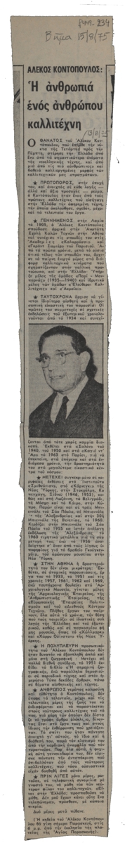 Απόκομμα εφημερίδας, στα ελληνικά, χαρτί, 50,2×5,8 εκ. Άρθρο για τον Αλέκο Κοντόπουλο με αφορμή τον θάνατό του το 1975. Εικονογραφείται με αναπαραγωγή φωτογραφίας του καλλιτέχνη. Επάνω, επιγραφή με τα στοιχεία δημοσίευσης.