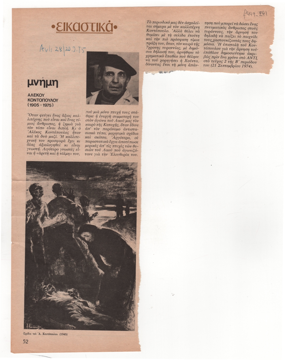Απόκομμα, έντυπο, στα ελληνικά, χαρτί, 27,7×21,0 εκ., όπου δημοσιεύεται, άρθρο για τον ζωγράφο Αλέκο Κοντόπουλου με αφορμή τον θάνατό του το 1975. Επάνω επιγραφή με τα στοιχεία δημοσίευσης. Στην πίσω όψη απόσπασμα της κριτικής των παραστάσεων της περιόδου από την Άννυ Θ. Κολτσιδοπούλου.