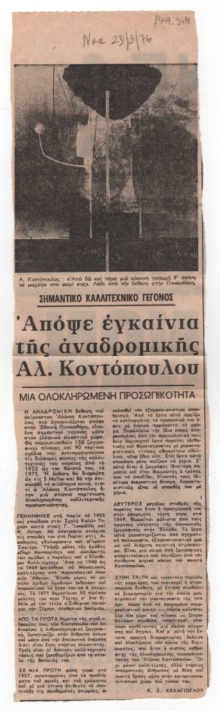 Απόκομμα εφημερίδας, στα ελληνικά, χαρτί, 36,0×10,0 εκ. Άρθρο του Κ. Σ. Κεχαγιόγλου για τα επικείμενα εγκαίνια της αναδρομικής έκθεσης του ζωγράφου Αλέκου Κοντόπουλου στην Εθνική Πινακοθήκη το 1976. Εικονογραφείται με αναπαραγωγή έργου του καλλιτέχνη. Επάνω επιγραφή με τα στοιχεία δημοσίευσης.