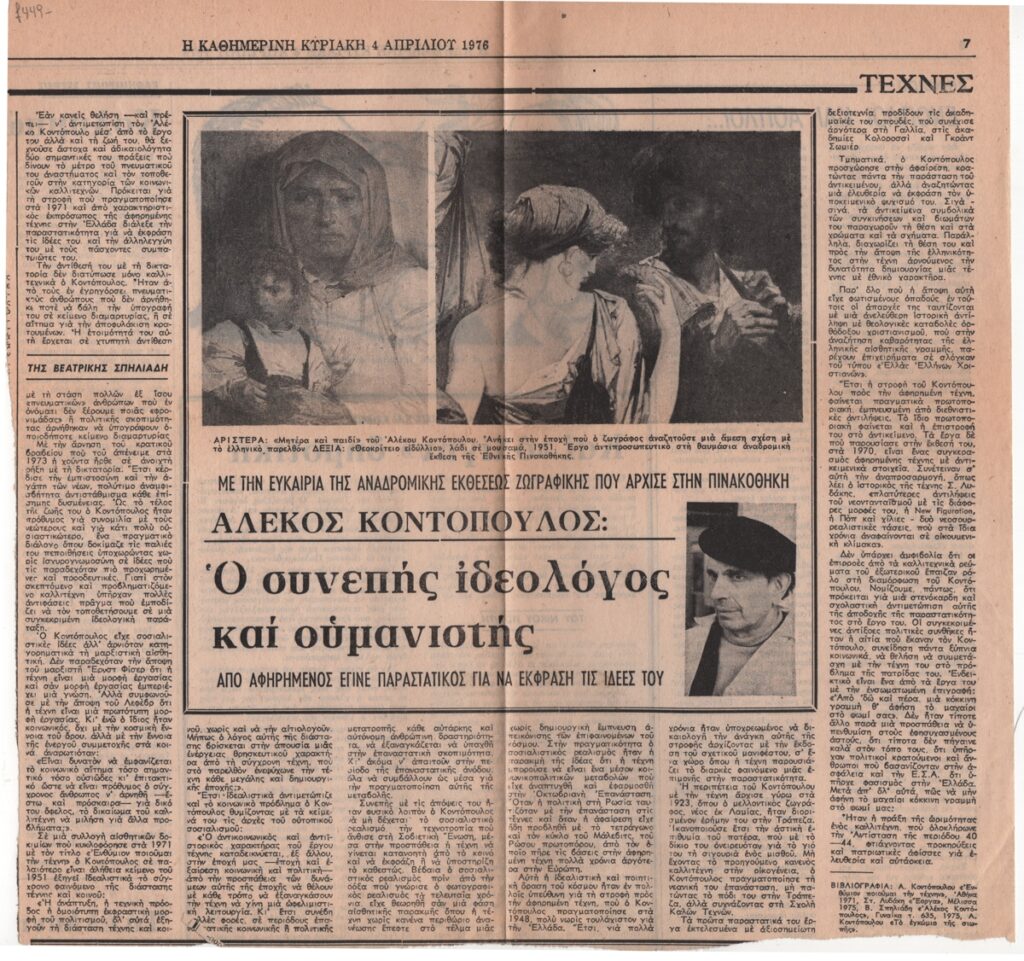 Απόκομμα, έντυπο, στα ελληνικά, χαρτί, 31,5×31,0 εκ. Άρθρο της Βεατρίκης Σπηλιάδη για τον ζωγράφο Αλέκο Κοντόπουλο με αφορμή την αναδρομική έκθεση έργων του στην Εθνική Πινακoθήκη το 1976. Εικονογραφείται με αναπαραγωγή φωτογραφίας και έργων του καλλιτέχνη. Στην πίσω όψη απόσπασμα άρθρου του Νίκου Πολίτη, με τίτλο “Και ‘ολίγην’ δημοτική”.