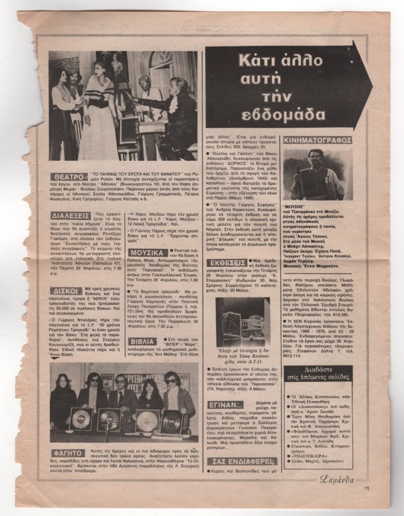Απόκομμα περιοδικού, στα ελληνικά, χαρτί, 2 φύλλα., 30×22,5 εκ. Πολιτιστική επικαιρότητα της περιόδου. Αναγγέλλονται: 1) η θεατρική παραγωγή του έργου του Ρομαίν Ρολάν με τίτλο “Το παιχνίδι του έρωτα και του θανάτου” από τον θίασο Δημήτρη Μυράτ – Βούλας Ζουμπουλάκη, 2) η βράβευση των Γιώργου Νταλάρα, Άννας Βίσση, Χάρις Αλεξίου και Γιάννη Πάριου με χρυσούς και πλατινένιους δίσκους, 3) το ρεσιτάλ της πιανίστριας Θάλειας Μίρα στον “Παρνασσό”, 4) η ομιλία του Γιώργου Καμπανά με θέμα το δημοτικό τραγούδι, 5) η κυκλοφορία του βιβλίου “Θύελλα και Γαλήνη” του Νίκου Αθανασιάδη, 6) η έκτη έκδοση του βιβλίου του Νίκου Καραντώνη για τον ποιητή Γιώργο Σεφέρη, 7) η ομαδική έκθεση ζωγραφικής στην γκαλερί “Κ. Σταυρακάκη”, 8) η λήξη της έκθεσης του Τάκη Κατσουρίδη, 9) η έκθεση έργων της Ευθυμίας Δελημάκη στον “Παρνασσό” και 10) η προβολή της κινηματογραφικής ταινίας “Μωυσής” του Τζιανφράγκο ντε Μποζίου με πρωταγωνιστές τους Μπαρτ Λάνκαστερ και Ειρήνη Παππά.