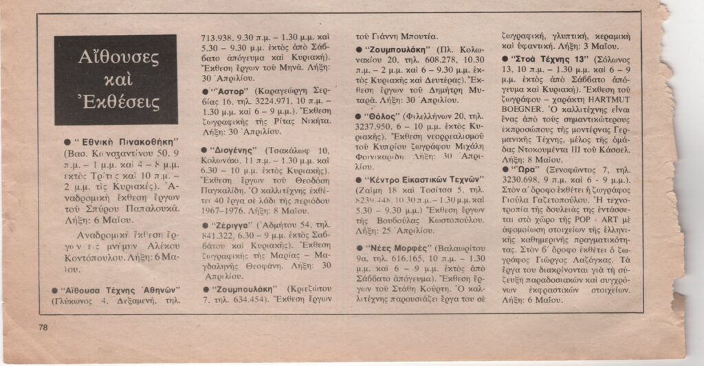Απόκομμα, έντυπο, στα ελληνικά, χαρτί, 2 φύλλα, 30×22,5 εκ. Εκθεσιολόγιο της περιόδου Απρίλιος – Μάιος 1976. Στην ίδια σελίδα κριτική της έκθεσης του Μίκη Φοινικαρίδη. Σε άλλες σελίδες του τεκμηρίου: άρθρο της Ντόρας Ηλιοπούλου Ρογκάν για τον Αλέκο Κοντόπουλο, άρθρο του Α. Δ. Σκιαδά με τίτλο “Ο θάνατος του Θεού” και πολιτιστική επικαιρότητα της περιόδου.