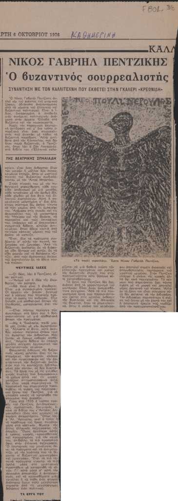 Απόκομμα, χαρτί ακανόνιστου μεγέθους, στα ελληνικά, δημοσίευσης κριτικής έκθεσης του Νίκου Γαβριήλ Πεντζίκη, η οποία διεξάγεται στην Γκαλερί Κρεωνίδης, στην Αθήνα.