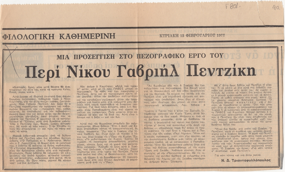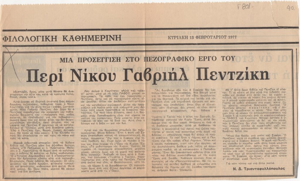 Απόκομμα, χαρτί, 18,5×31 εκ., στα ελληνικά, δημοσίευσης άρθρου αναφερόμενου στο πεζογραφικό έργο του Νίκου Γαβριήλ Πεντζίκη.
