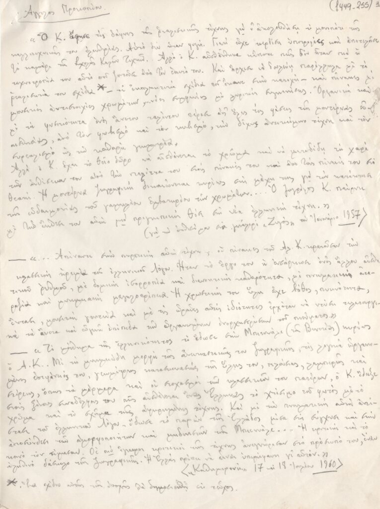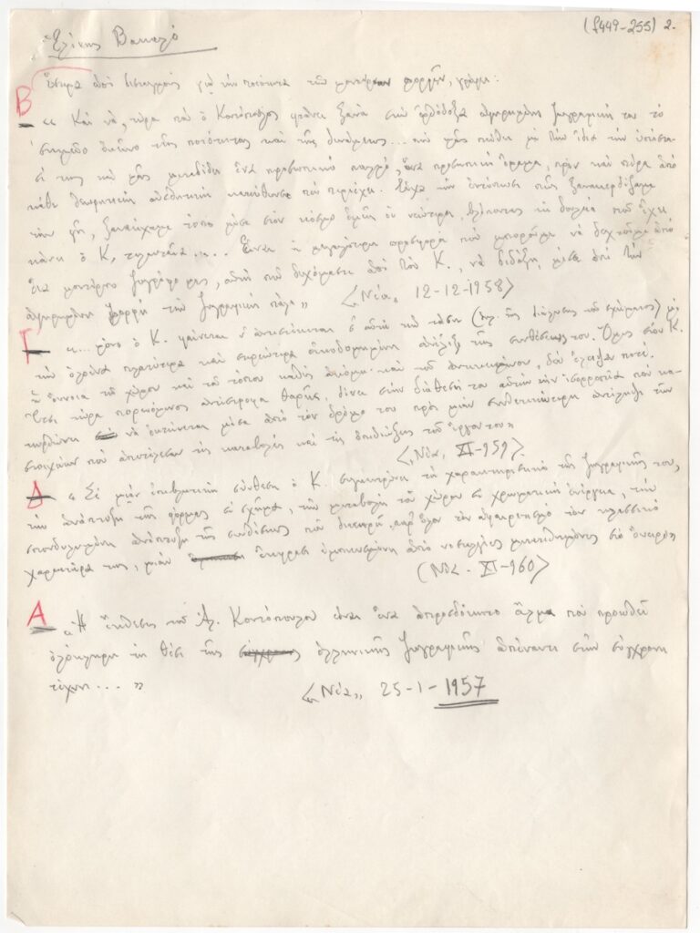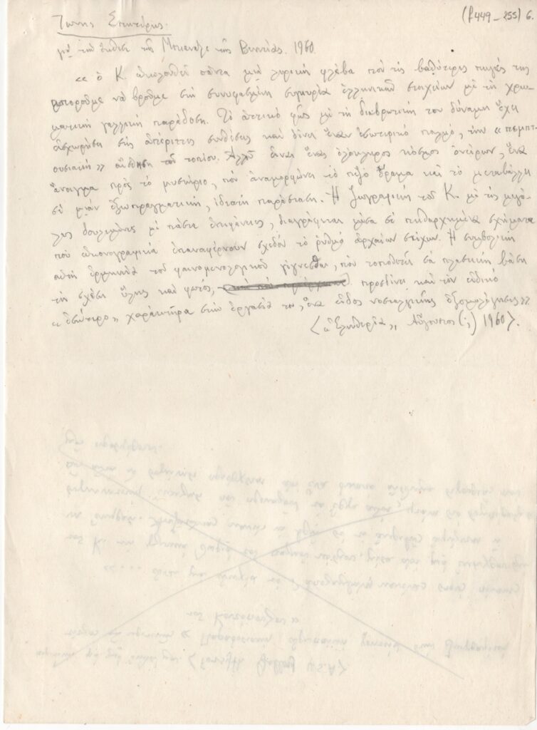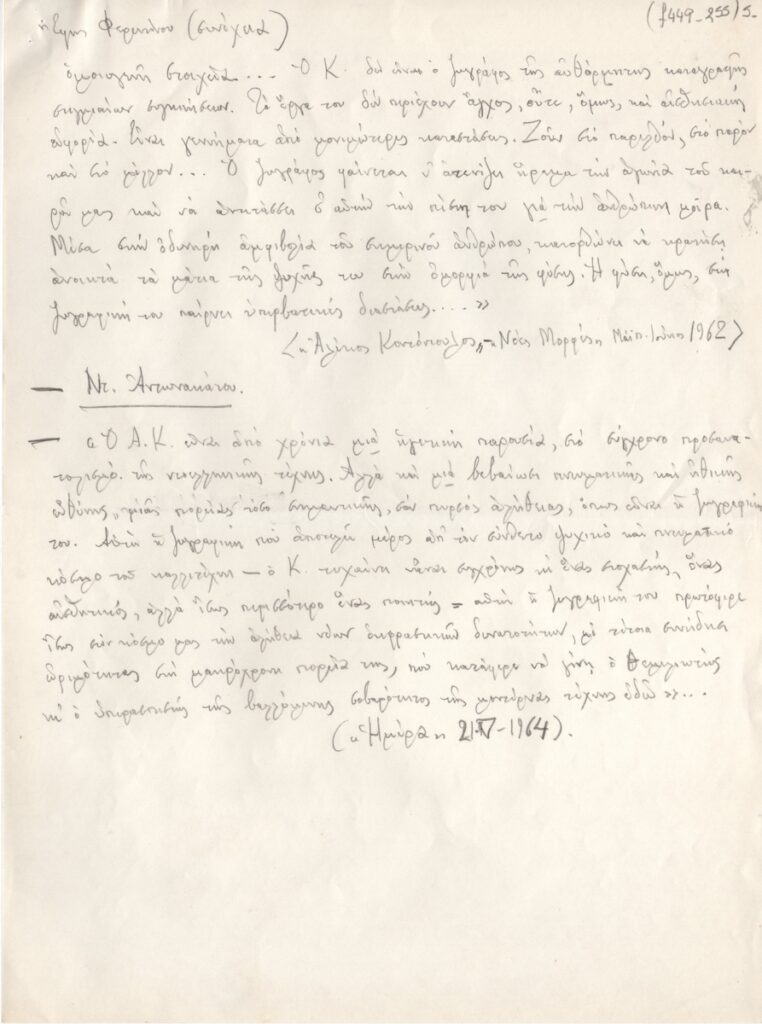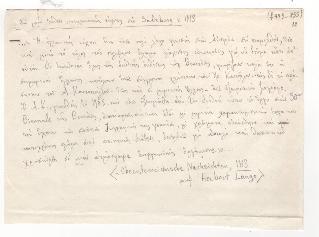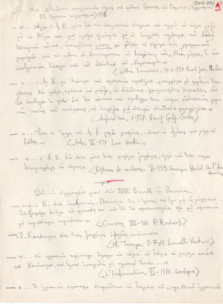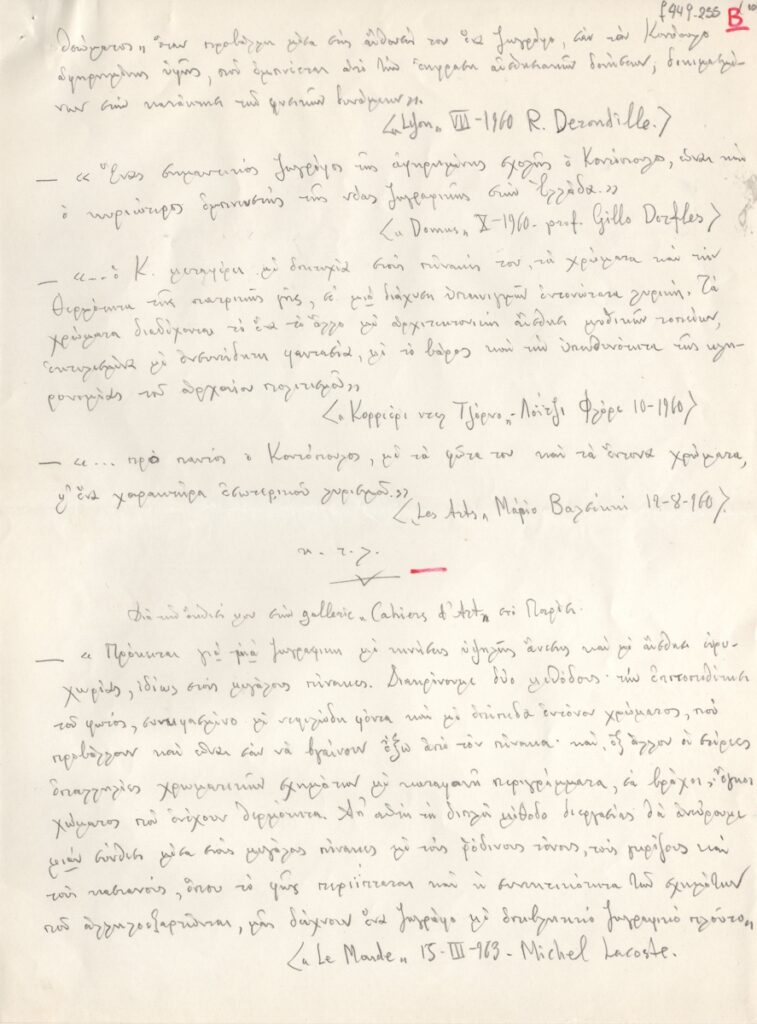 Κείμενο, χειρόγραφο, με μολύβι, στα ελληνικά, χαρτί, 11 φφ., 13,8×21,3 και 28,7×21,4 εκ. Αποδελτιώνονται κριτικές που δημοσιεύτηκαν στα παρακάτω έντυπα: “Arts” (06/1959), “Arts” (12/08/1960), “Aujourd’hui” (06/1959), “Il Corriere del Giorno” (10/1960), “Il Tempo” (03/07/1960), “L’Information” (06/1960), “Le Monde” (15/03/1963),