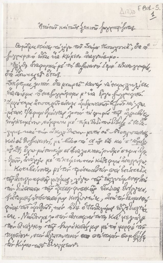 Φωτοαντίγραφο, χαρτί, 3 φφ, 24,5×16 εκ., στα ελληνικά, κειμένου του Νίκου Γαβριήλ Πεντζίκη στο οποίο αναφέρεται στη ζωγραφική του.