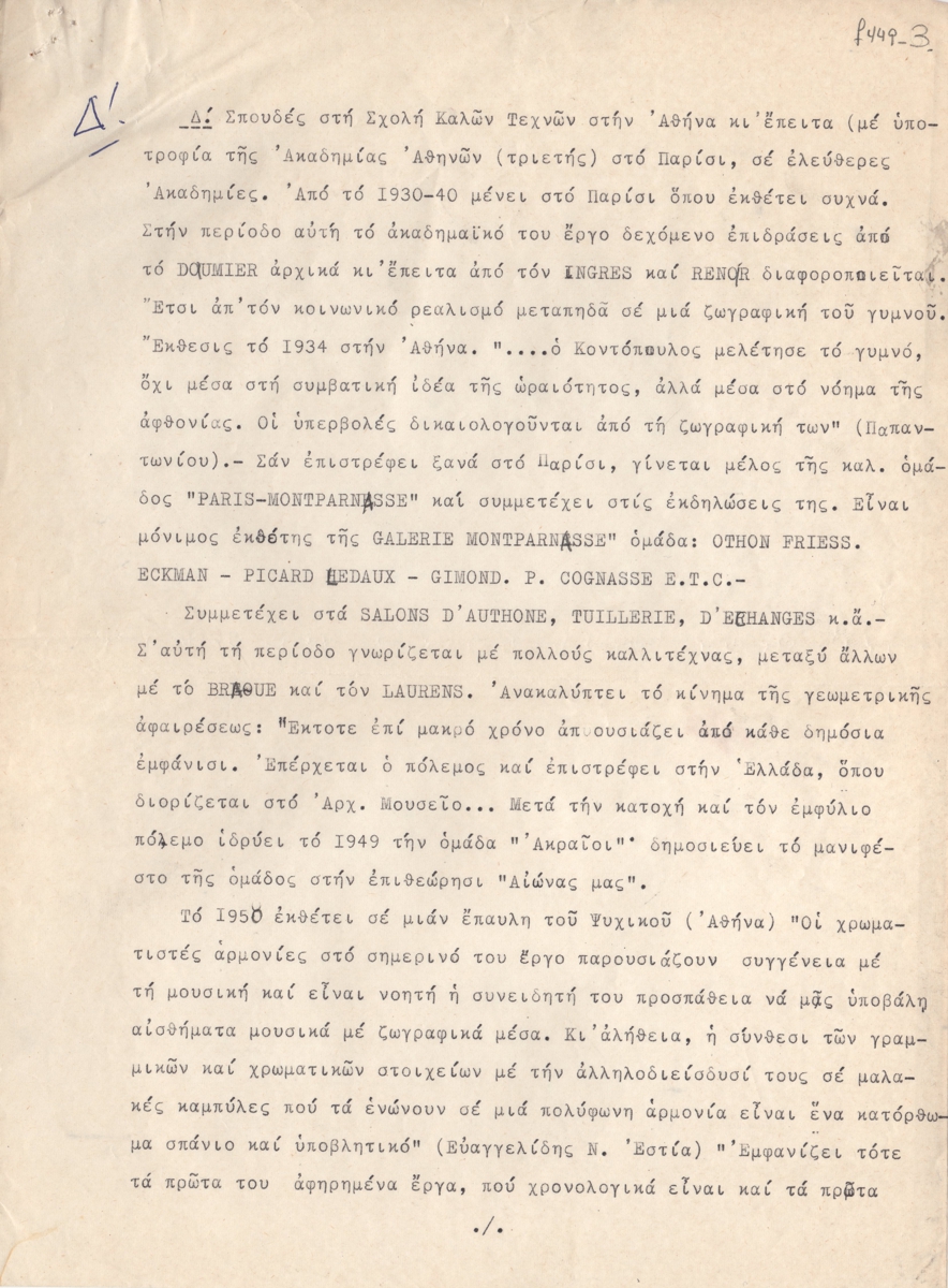 Κείμενο, δακτυλόγραφο, στα ελληνικά, χαρτί, 2 φφ., 29,2×21,3 εκ. Απόσπασμα κειμένου για τη ζωή και το έργο του Αλέκου Κοντόπουλου που αφορά στις σπουδές του καλλιτέχνη στην Αθήνα και το Παρίσι, την δραστηριότητά του στο Παρίσι, τη συμμετοχή σε ομαδικές και ατομικές εκθέσεις. Επίσης, απόσπασμα του βιογραφικού αφορά την κριτική αποτίμηση του έργου του.